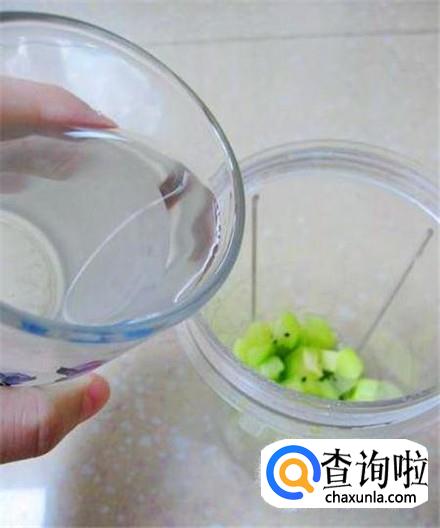 榨汁机里倒入一杯凉白开,有人喜欢加糖浆,或者是白糖,亦或是蜂蜜、冰糖水,都是可以的,随你自己。