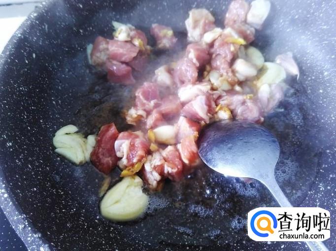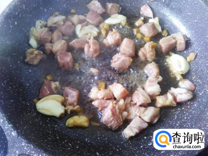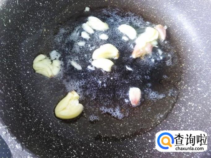 开火下油,油量比平常炒菜多些,放蒜米进去爆出味来。