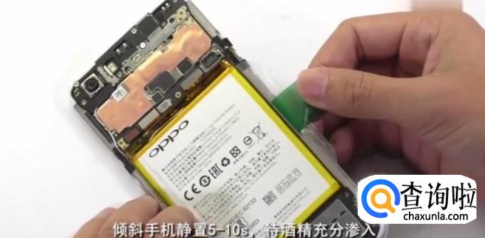 准备好酒精,滴入一两滴在侧口,倾斜手机静止五到十秒,等待酒精渗入,如图所示。