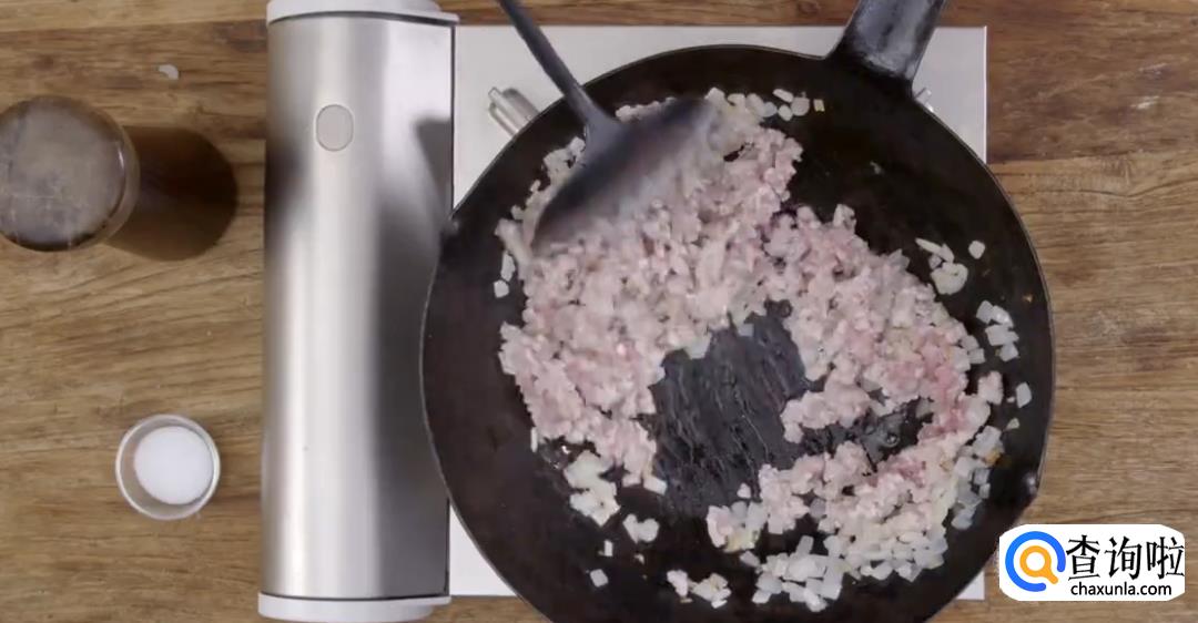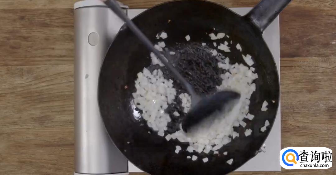 热锅起油,下洋葱碎煸炒至透明变软。