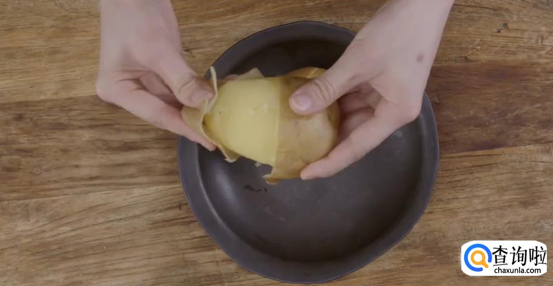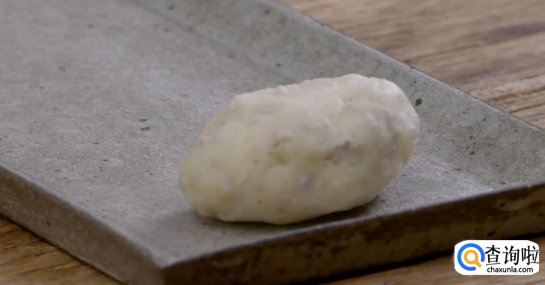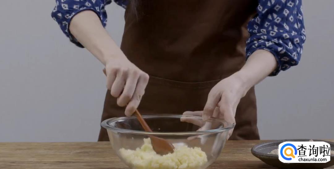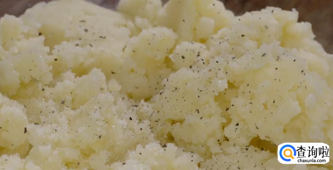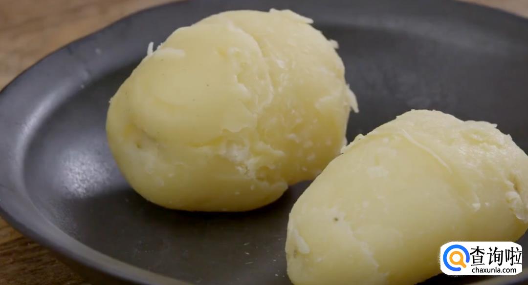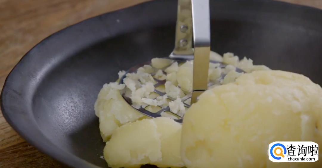放凉后将土豆皮剥下,然后用碾子碾压成土豆泥。