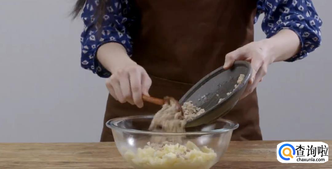 在土豆泥中加入适量盐巴,黑胡椒搅拌均匀,然后将炒好的洋葱肉末倒入,继续搅拌均匀。