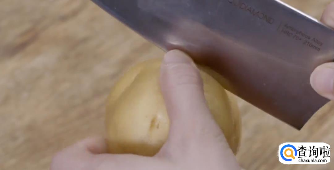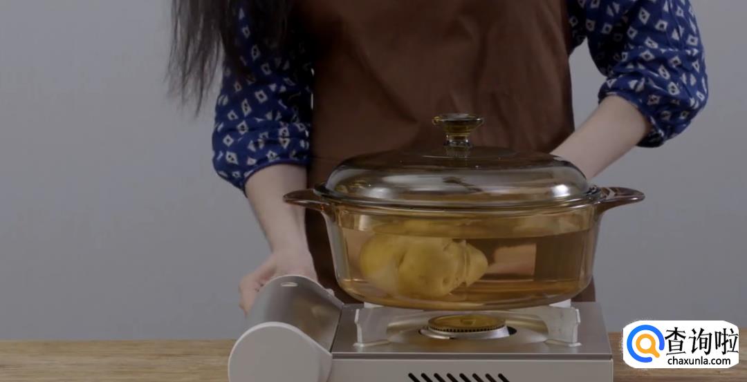 用刀在洗净的土豆上开一圈口,然后放入清水煮到熟透。筷子能插入程度为最佳。