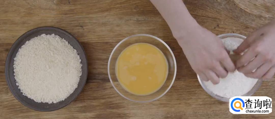 将土豆泥捏成椭圆状待用。依次将土豆泥放入面粉,蛋液,面包糠中过一圈。