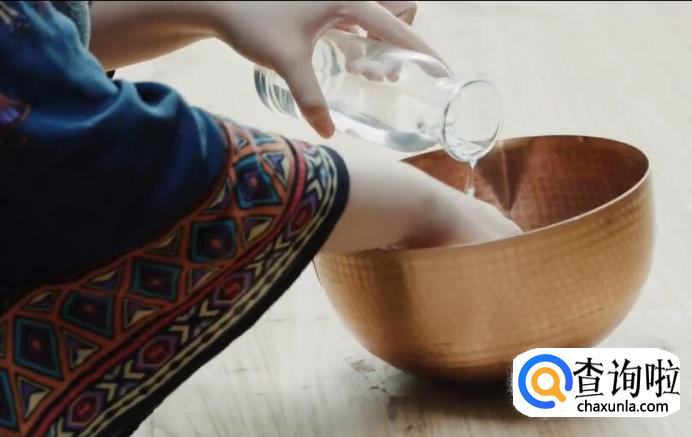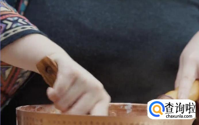 接着制作外皮。白玉粉放入铜锅中,分次加入冷水,和成面团。