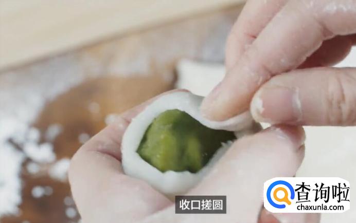 手上涂抹一点片栗粉,趁热吧抹茶草莓陷包入面团内,收口搓圆。