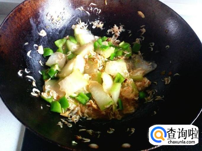 烧至冬瓜稍绵软,放入青椒,翻一下个,放入味精,关火出勺。