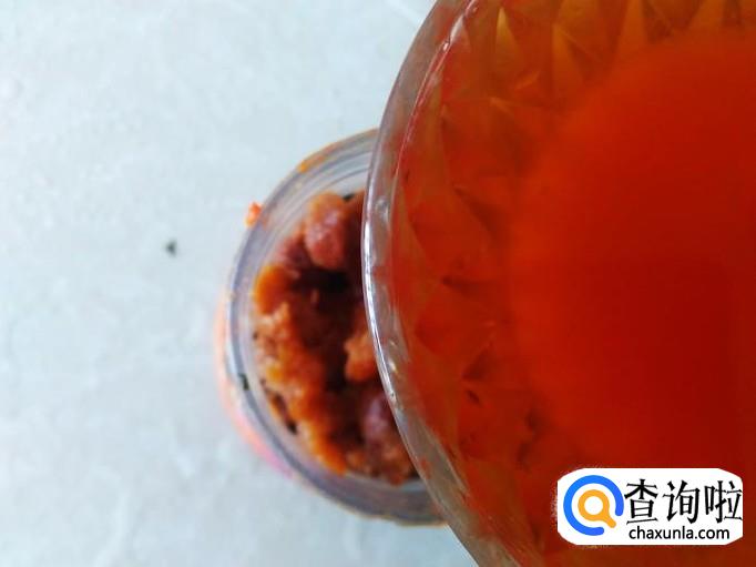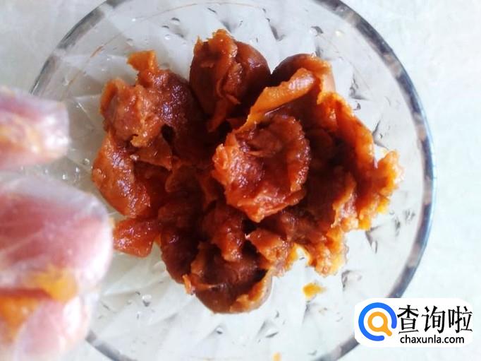 酸梅用手抓成果泥,放到瓶子。