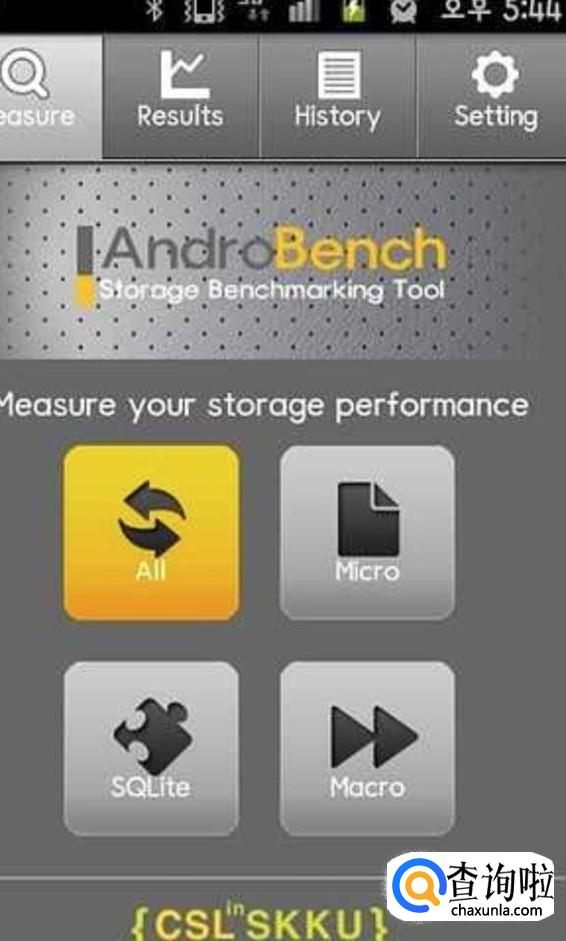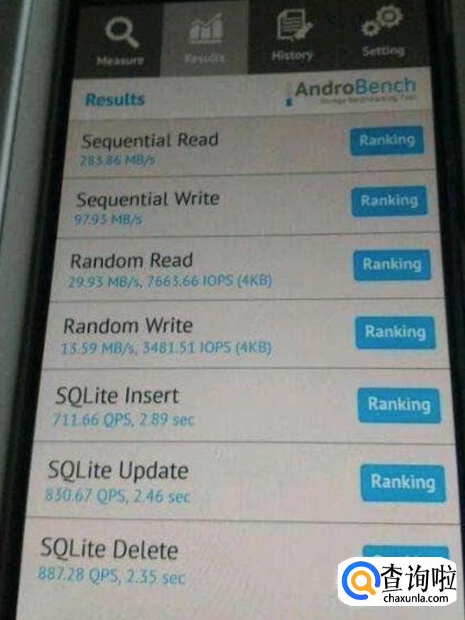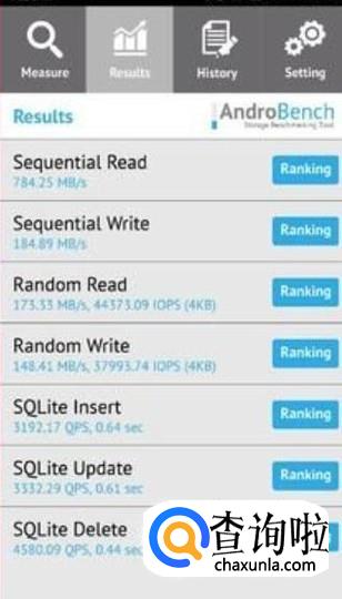 在应用商店内或者浏览器上下载一个名叫androbench的测试软件.