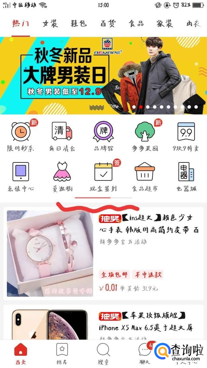 打开拼多多软件,进入首页界面,手指向左滑动。