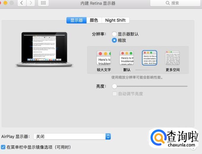进入内建retina显示器界面,在下方调整亮度右侧的按钮即可。