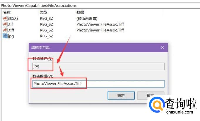 如果想要打开.jpg后缀的图片,新建名称就写为“.JPG”,在下面的数值数据中写入“PhotoViewer.FileAssoc.Tiff”,如图,点击确定。