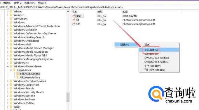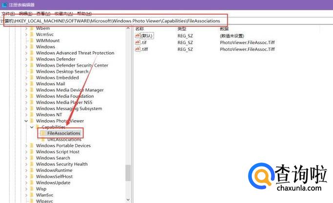 打开注册表编辑器后,单击左侧的目录,打开HKEY_LOCAL_MACHINESOFTWAREMicrosoftWindows Photo ViewerCapabilitiesFileAssociations路径,如下图。
