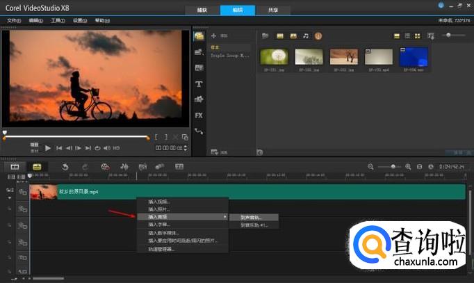 同样,再单击鼠标右键,选择插入音频,到声音轨或音乐轨都可以