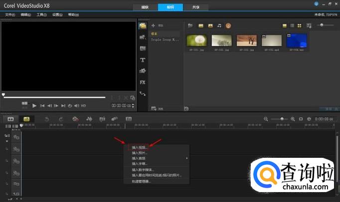 打开会声会影,鼠标移动到轨道,单击右键,选择插入视频