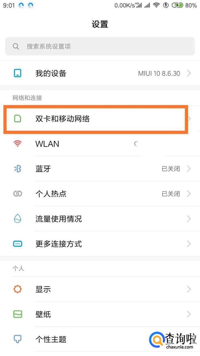 首先打开红米4的设置,然后点击“网络和连接”的第一个选项“双卡和移动网络”。