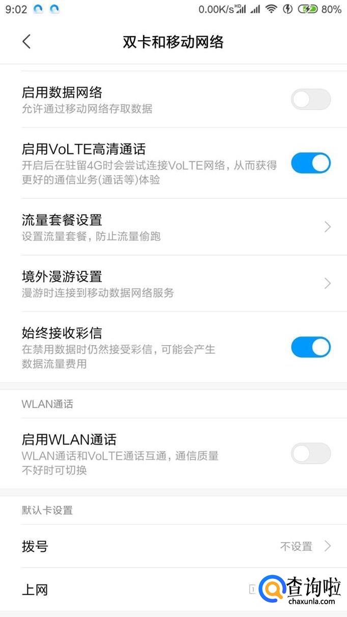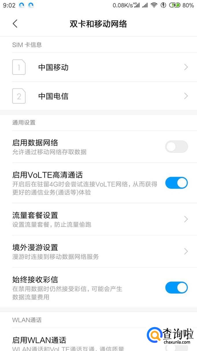 现在就可以看到关于双卡和移动网络的设置了,在这里可以选择是否打开数据流量和开启高清通话提升音质。