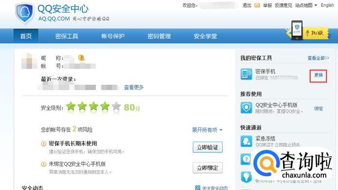 弹出安全中心首页,在页面右边我们可以看到密保手机,点击后面的【更换】。