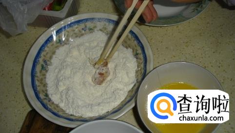先在干淀粉中拍匀,再在蛋液中滚一圈。