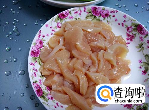 鸡脯切成薄片,用胡椒粉、黄酒和少许盐腌制片刻。