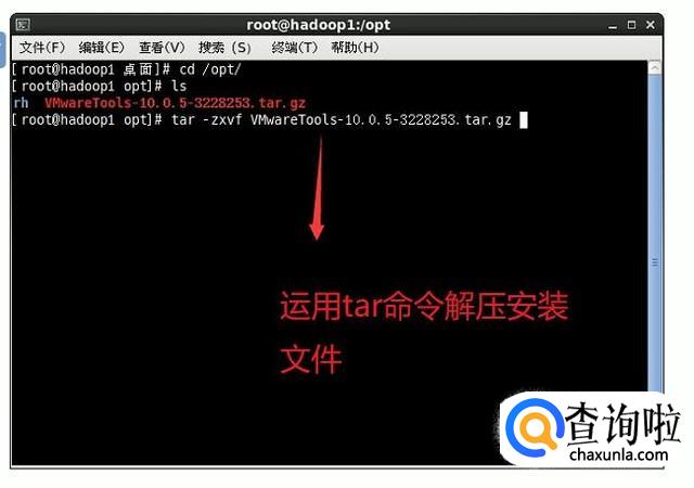 然后我们打开终端窗口,用tar命令对安装包进行解压,如下图所示,注意参数要带全