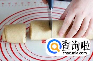 然后把檊好的面饼从一边卷起来,卷成一条面卷,再用菜刀切成小段。