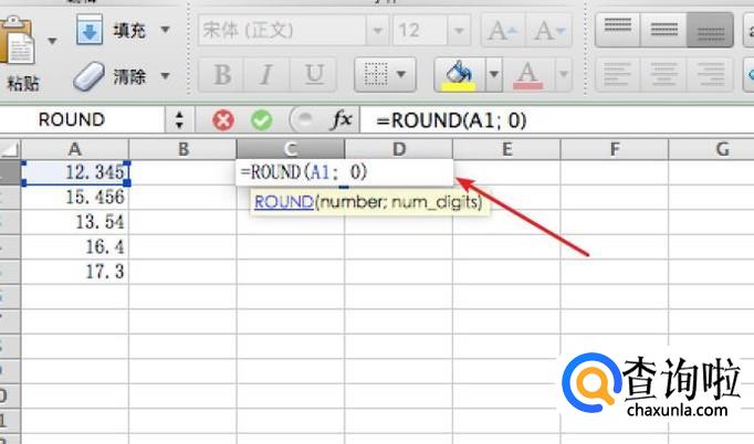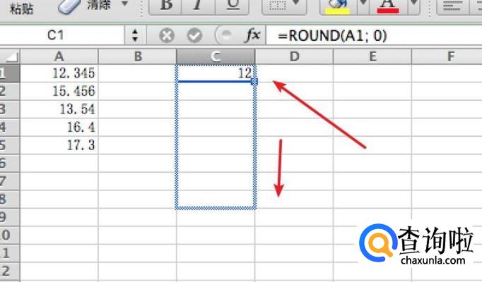 在C1单元格输入函数=ROUND(A1; 0),表示是对A1单元格做四舍五入,后面的0表示小数位为0位。
