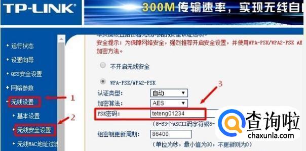 点击“无线设置”、“无线安全设置”、修改“PSK密码”、点击“保存”,如下图所示。