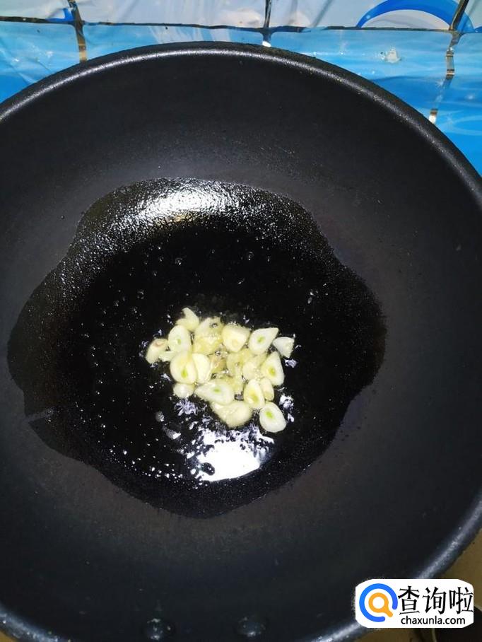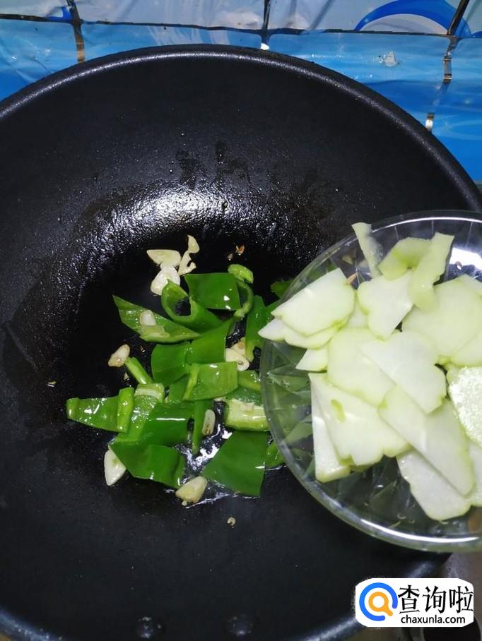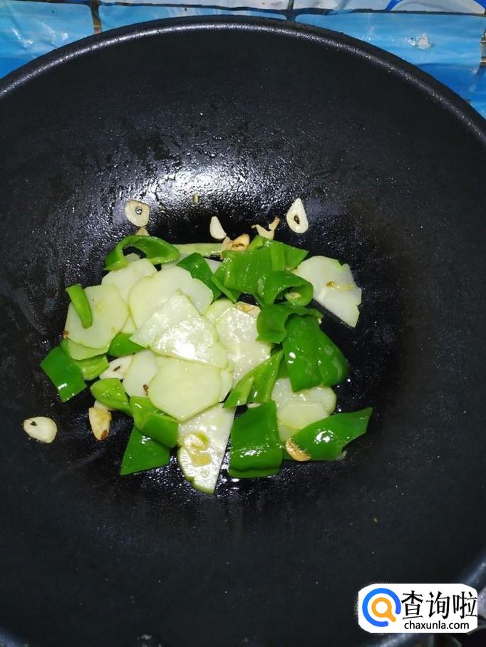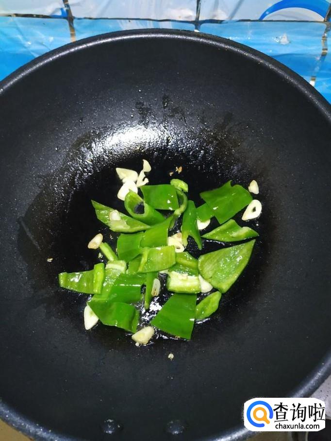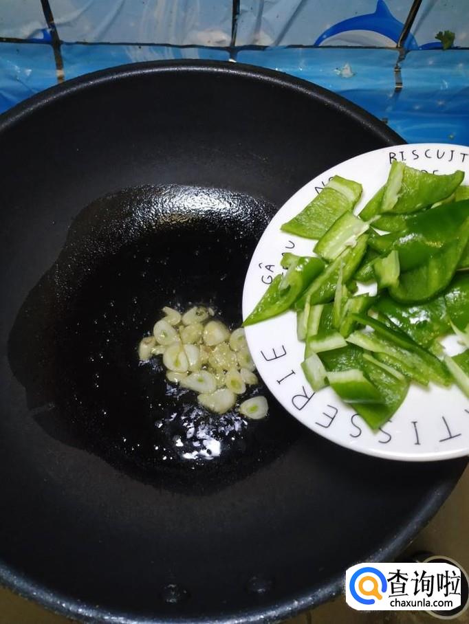 炒锅中放入适量油,油热后将蒜片放入锅中炒香,然后将青椒倒入锅中,翻炒均匀。