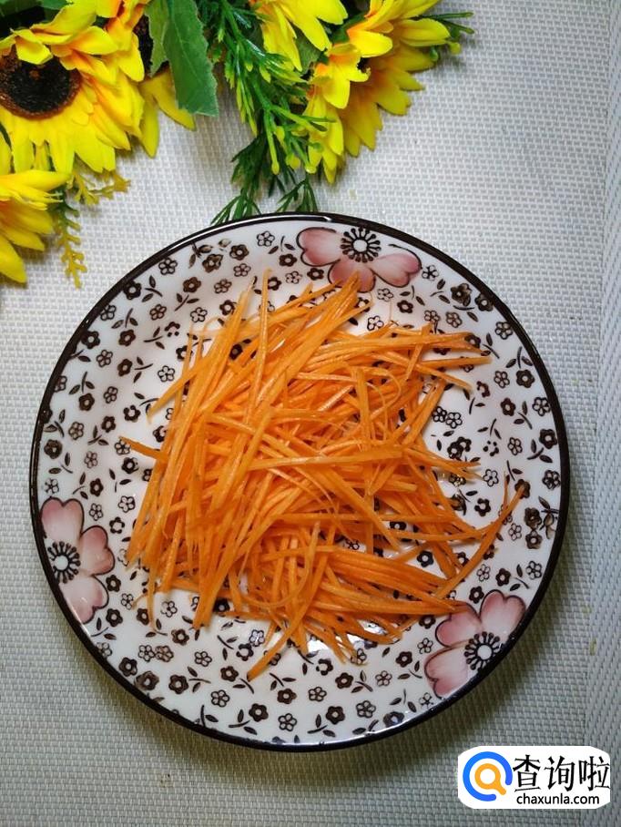 将胡萝卜丝倒入锅中,和其他食材一起翻炒。