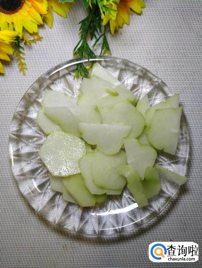 将佛手瓜去皮,去瓤,切成片,放入盘中备用;将青椒切成小片;取适量胡萝卜擦成丝,放入盘中备用。