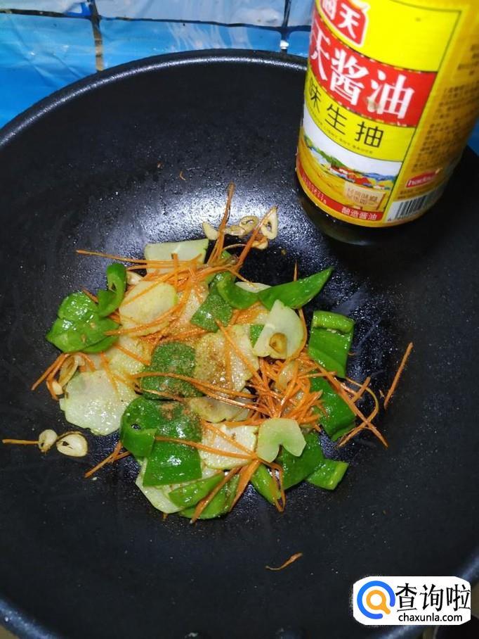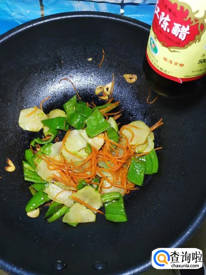 加入适量生抽,增色,再加入少许清水,防止粘锅,大约炒两分钟左右,加入适量陈醋提鲜。