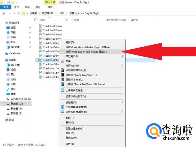 首先右击需要播放的音频文件,然后点击“使用 Windows media player 播放”。