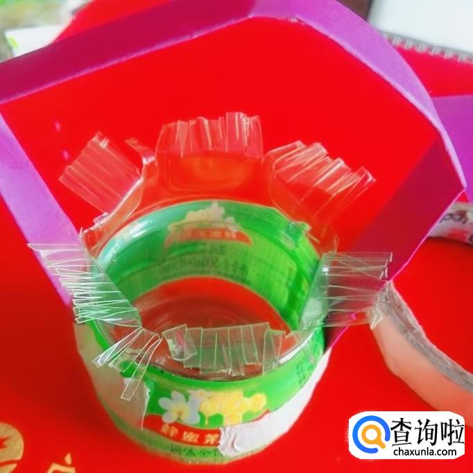 接着用胶纸把彩纸粘在瓶子上。如图所示。