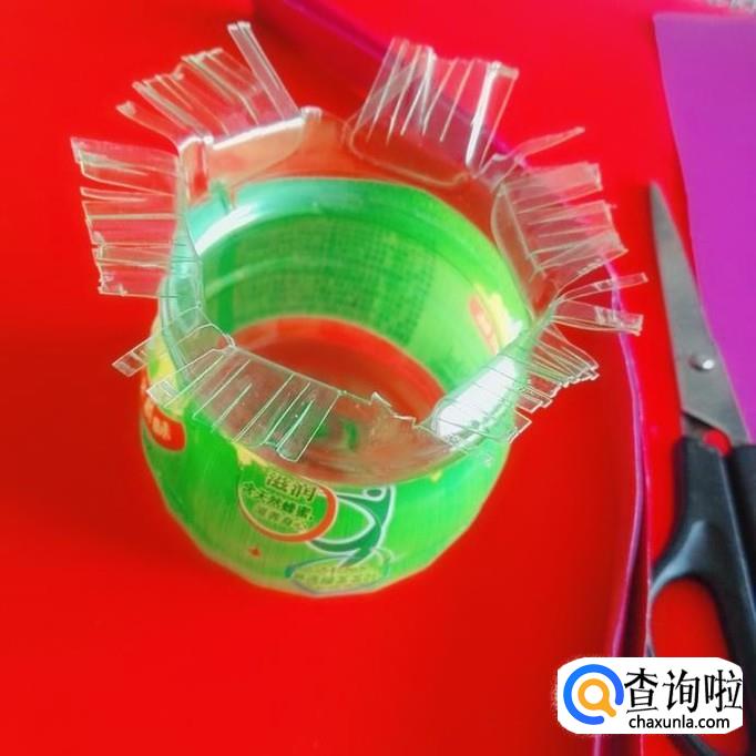 再用剪刀把矿泉水瓶子一端剪成细条,如图所示。