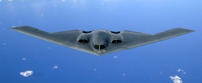 20世纪80年代美国研制了B-2“幽灵”战略隐身轰炸机,它的外形隐身措施更具有特色。首先,它的机身、机翼、发动机舱交接处采用弧面连接,融为一体,整个外形呈三角形飞翼结构,蒙皮表面平整,克服了雷达波绕射大的倾向。飞机上干脆不设置垂直尾翼,消除了尾翼和机身间的角反射器效应。发动机隐藏在机体内的背部,没有吊舱,机体后缘呈锯齿形,外侧机翼伸出很多。它的尾喷管呈V形,处在机体的背部,大大降低被雷达和红外探测的机会。在发动机的尾气中,还喷入氟氯硫酸液,以消除目视尾迹。另外,机身上还涂有深灰色的隐身涂料,对于雷达、红外和可见光都有隐身能力。机翼面积大,可以使机翼的前后缘都镶入厚的吸波材料。机上的各种结构都采取了隐身措施,有效地降低了被发现的概率,提高了生存能力。