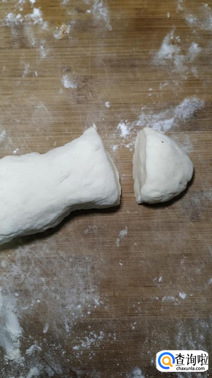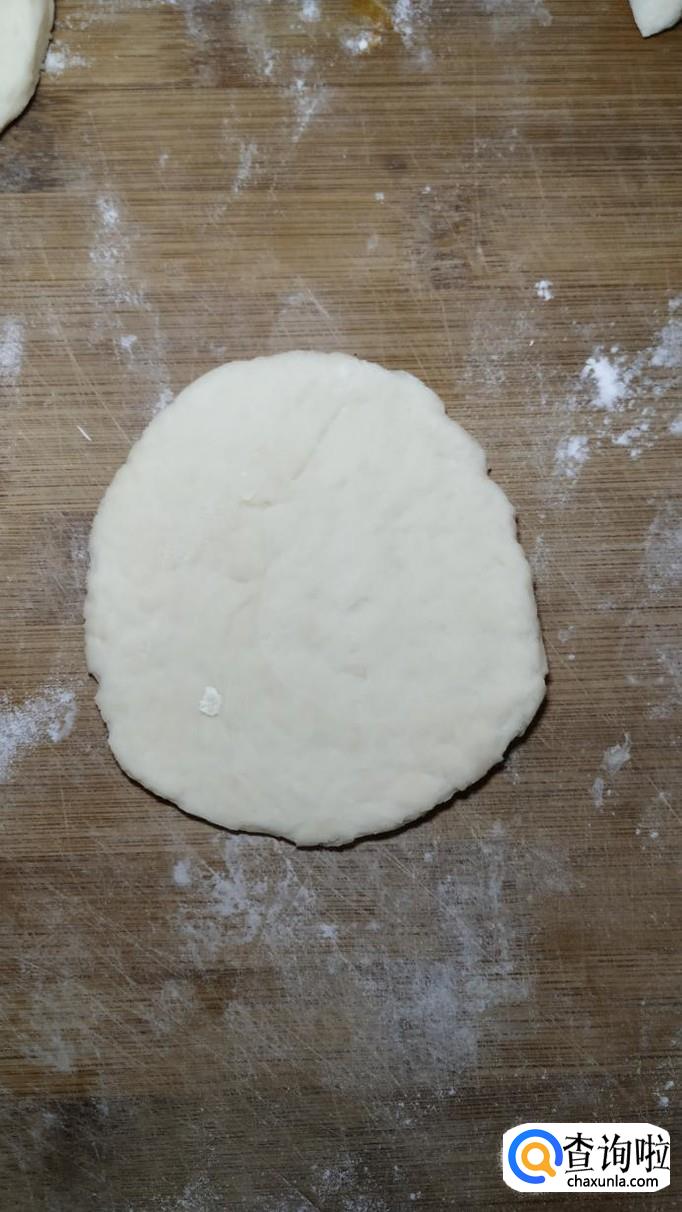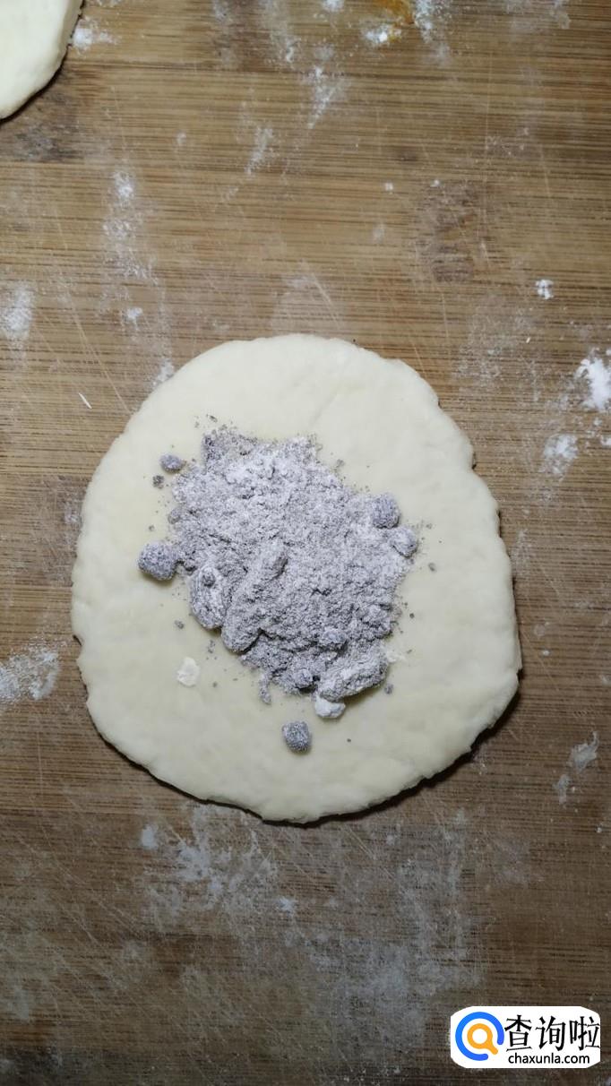 将醒发好的面团揉一下,搓成长条,分成小剂子,然后擀成圆形的面片,在中间放上糖馅。