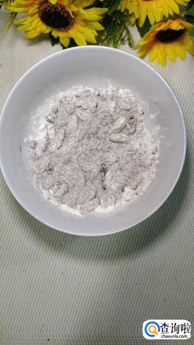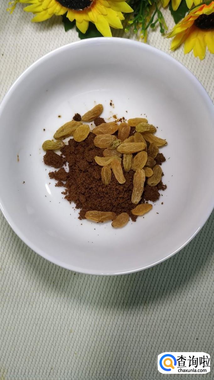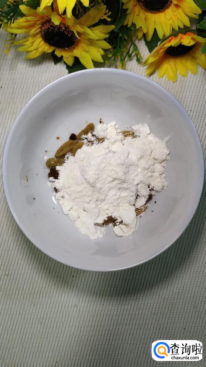 碗中放入适量红糖,再加入葡萄干儿,加入少许面粉,搅拌均匀,做成糖馅。