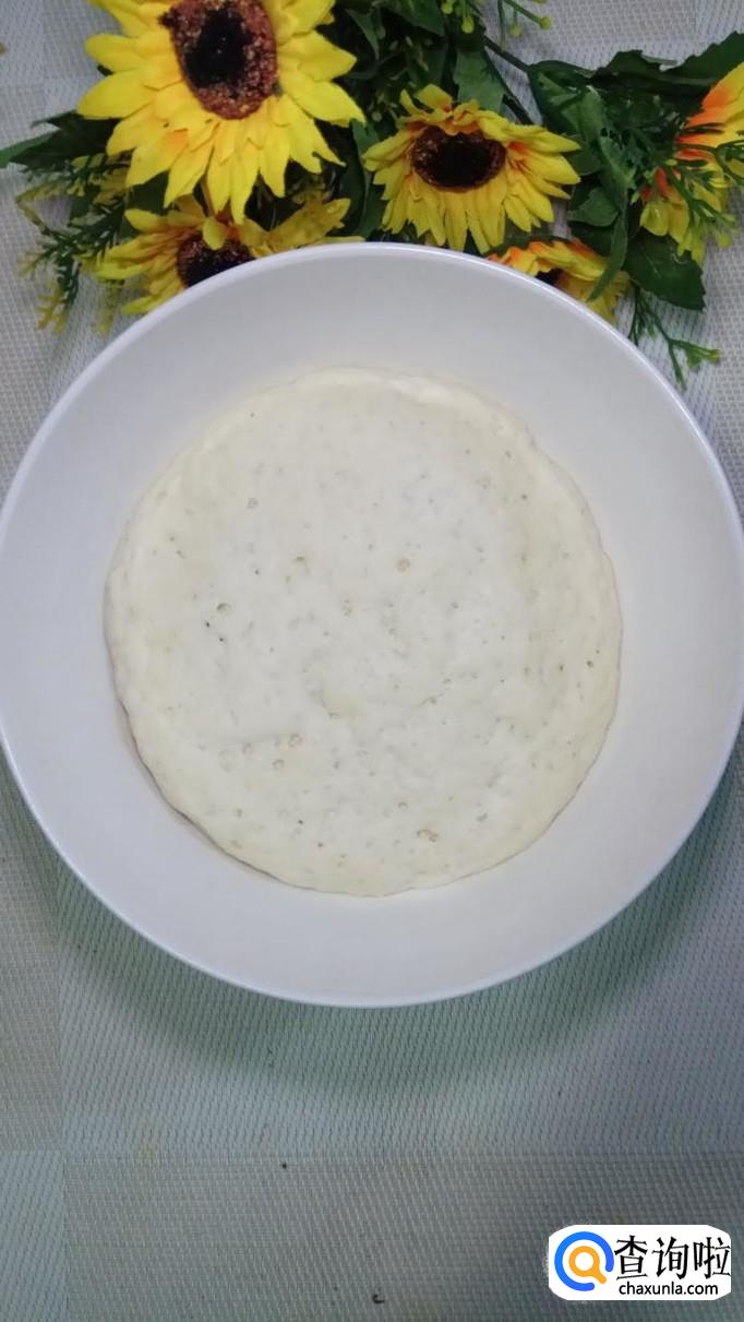 将做好的面团盖上保鲜膜,放到温暖的地方,醒发至两倍大,等到面团出现蜂窝状就差不多了。