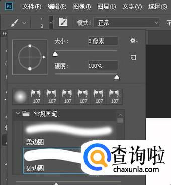 接着,按B键,调出画笔工具,在属性栏中设置笔刷为硬边圆,大小为3像素