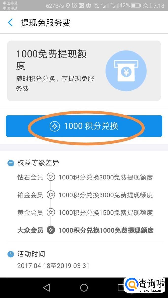 最后点击【1000积分兑换】就可以增加支付宝提现免费额度了,如图