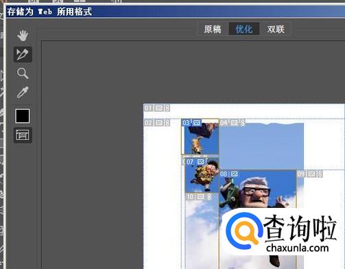 鼠标已呈刀子的状态,把鼠标移到图片的目标位置,点住再拖拉,拉出一个范围,把目标图像切片。如此操作,把其它图像一 一操作。