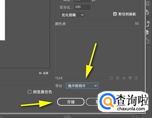 再看操作界面的右下方这里,在“导出”这里点击下的按钮,弹出的下拉菜单中点:选中的切片;接着,再点:储存
