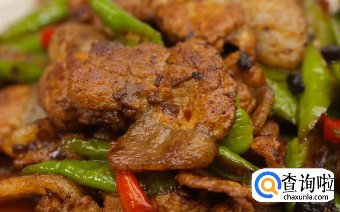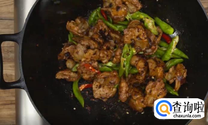 最后下青椒和朝天椒,转中小火,加一点酱油炒匀,即可关火。这样,一道干香四溢的生爆盐煎肉就完成了。