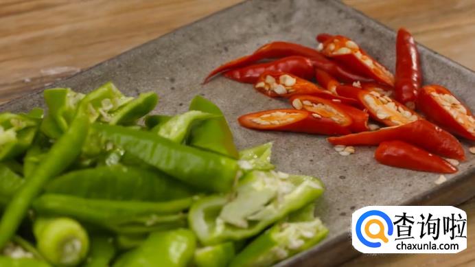 接下来准备配料。配料主要是二荆条青椒和朝天椒,把它们都切成滚刀块待用。