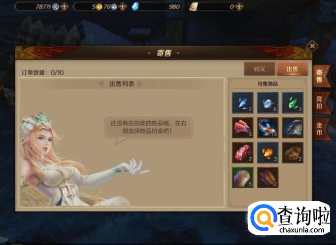 玩家也可以把自己不需要的物品进行出售,进入到【寄售】→【出售】页面后,接着选中要出售的物品。