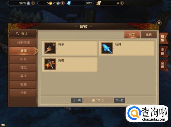之后进入到【寄售】页面,在【寄售】→【购买】页面玩家可以从别的玩家那里购买获得自己需要的东西。
