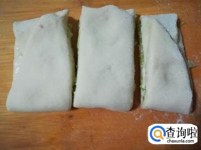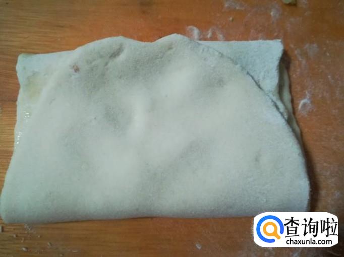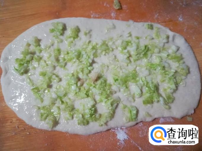 再给面皮上抹一层胡油,一层盐,一层圆白菜碎粒。