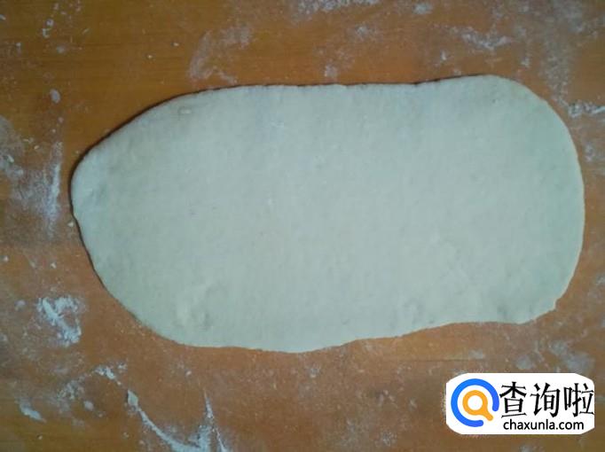 把发酵好的面团,放案板上,撒上5克小苏打粉,揉匀揉透后,擀成薄的面皮。