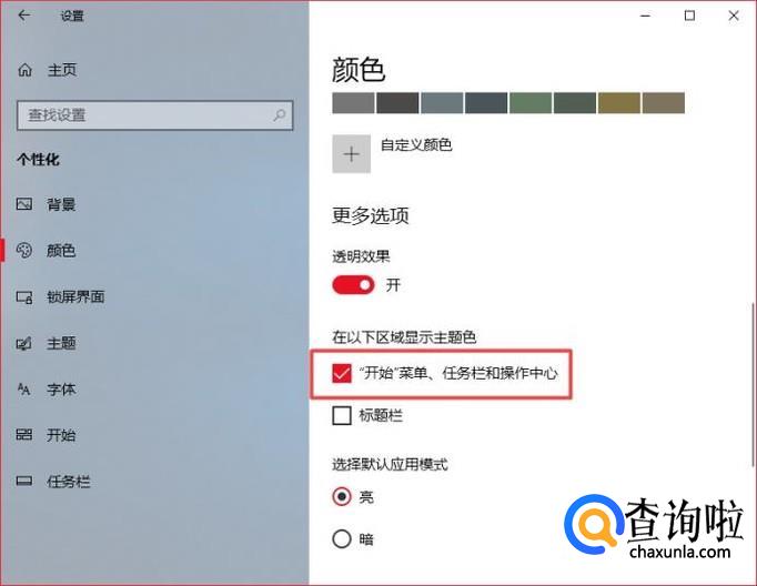 之后我们下拉界面,然后将“开始”菜单、任务栏、操作中心给勾选上,这样就将颜色给更改好了。